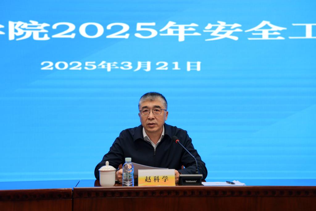赵科学在讲话中肯定了学校2024年安全工作,对部署2025年校园安全稳定工作,提出了三点意见。一是提高政治站位,强化政治担当,充分认识做好安全稳定工作的极端重要性,居安思危,警钟长鸣,以高度的使命感和紧迫感抓牢抓实学校安全工作。二是加强组织领导,落实安全责任,不断提升安全防范能力和水平,构建“大安全”工作格局,统筹国家安全、意识形态、校园安全、网络舆情、危机预防、心理健康教育等工作,各部门各单位协同联动,形成工作合力。三是围绕中心工作,聚焦重点任务,全力维护校园安全和谐稳定,着重做好消防安全、交通安全、食品安全、实验室安全、实习实训安全、校舍安全、建筑施工安全、防灾减灾和治安防范等方面工作,全面提升校园安全保障水平。